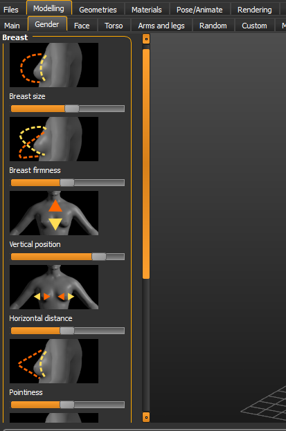 Another issue is about the 3 bottom sliders in the main tab: “Causasian“, “African”, “Asian”. It looks like you can define any human being by changing those 3 parameters. What's even more striking is that when you move one of the three sliders, the two other ones move consequently as they are correlated: they must make a total of 100%. And one could wonder what those parameters affect in the body produced.