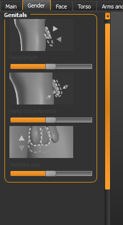 In the main parameters, having a slider for the gender can sound optimistic: we expect that the software acknowledge the non-binarity of human beings. But when we go to the Gender tab (you might need to install the Genitalia add-on), it's a different story.