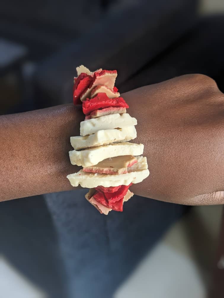 After 24 hours, the mixture has dried into a flexible, translucent sheet of bioplastic. The addition of glycerin has made it soft and stretchy, while the food coloring has given it a vibrant hue.
