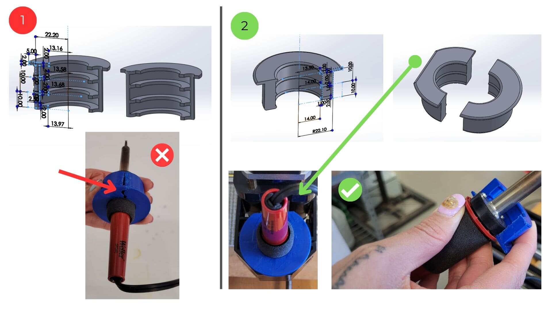 For the soldering iron holder, we designed a piece that was easy to install. To achieve this, we created it in two parts with a simple assembly. We also added internal ribs to securely hold the soldering iron and included a top tab to prevent it from sliding.