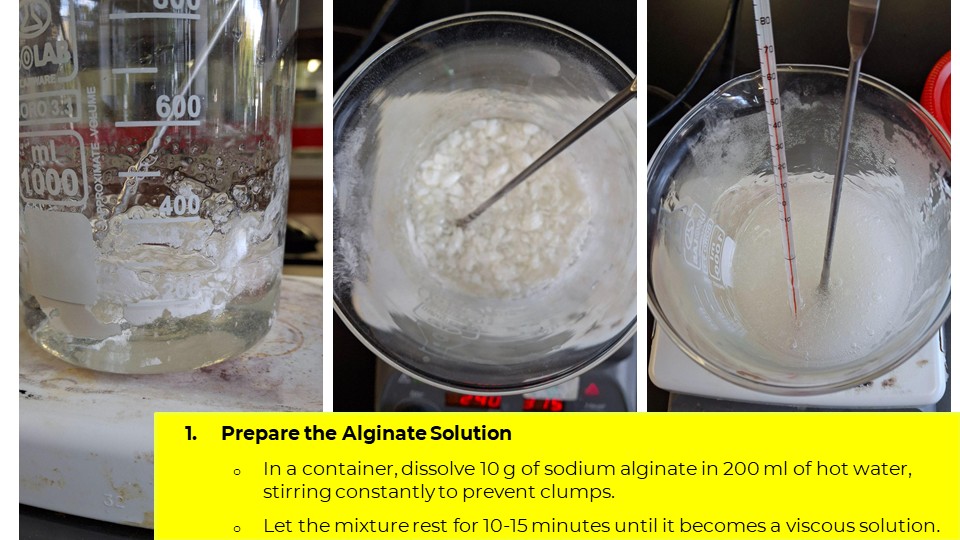 - Prepare the alginate solution: Dissolve 2–3 g of sodium alginate in distilled water (use part of the 200 ml). Stir until fully homogeneous.