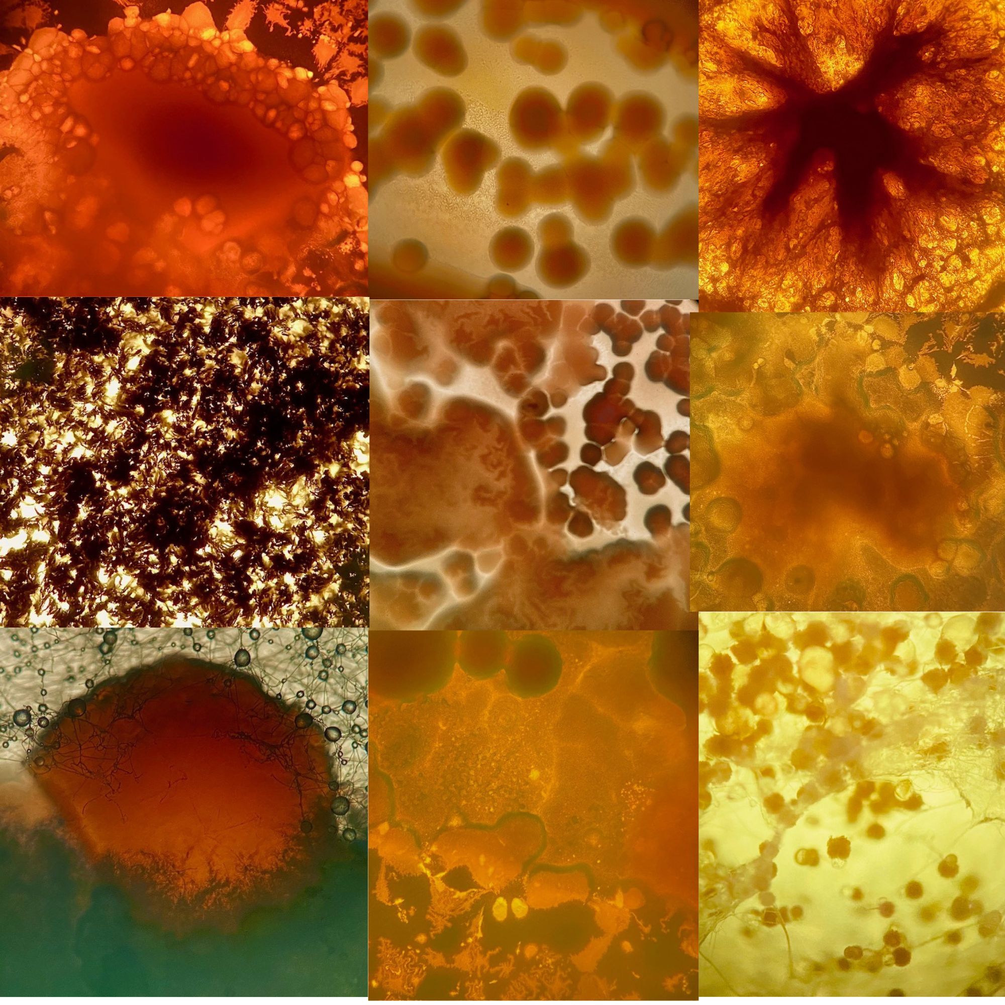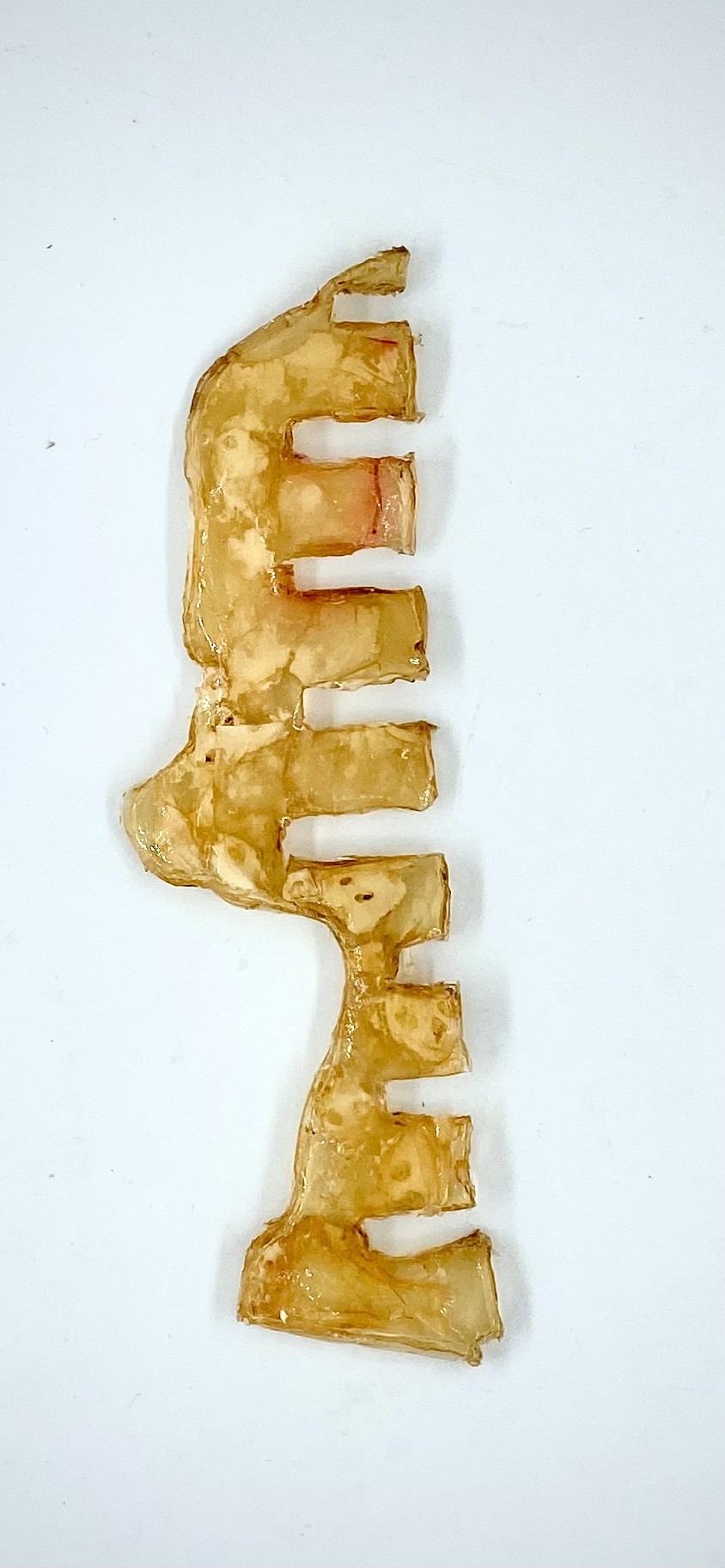 Procedure The ingredients are mixed at 60°C. Once a slightly yellowish, translucent solution is obtained, the mixture is poured into molds covered with the dried biofilms. The pieces are left to dry for 24 hours with constant airflow. They are then removed from the mold.