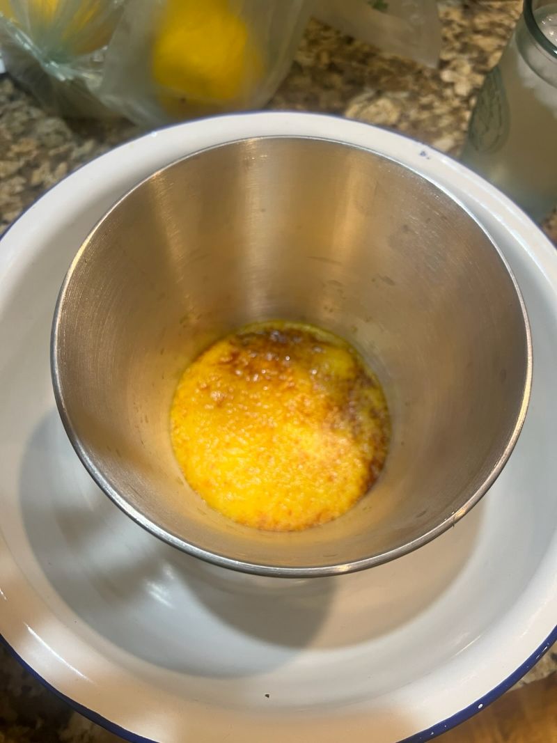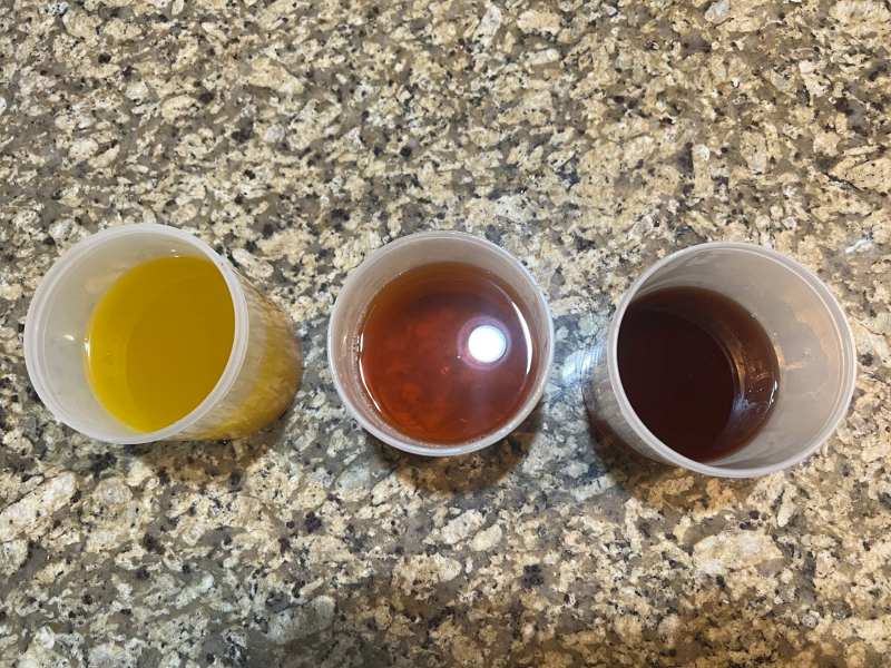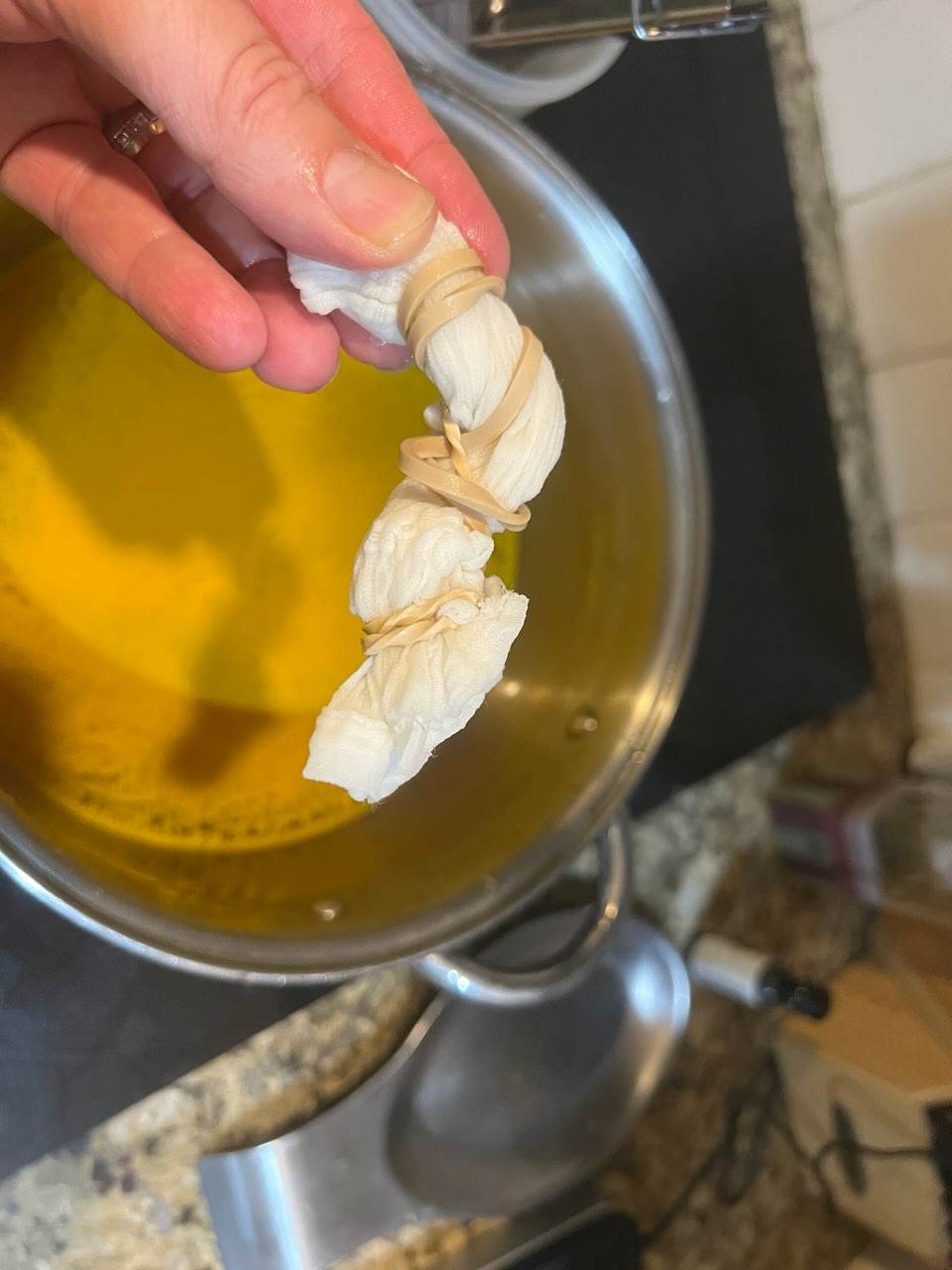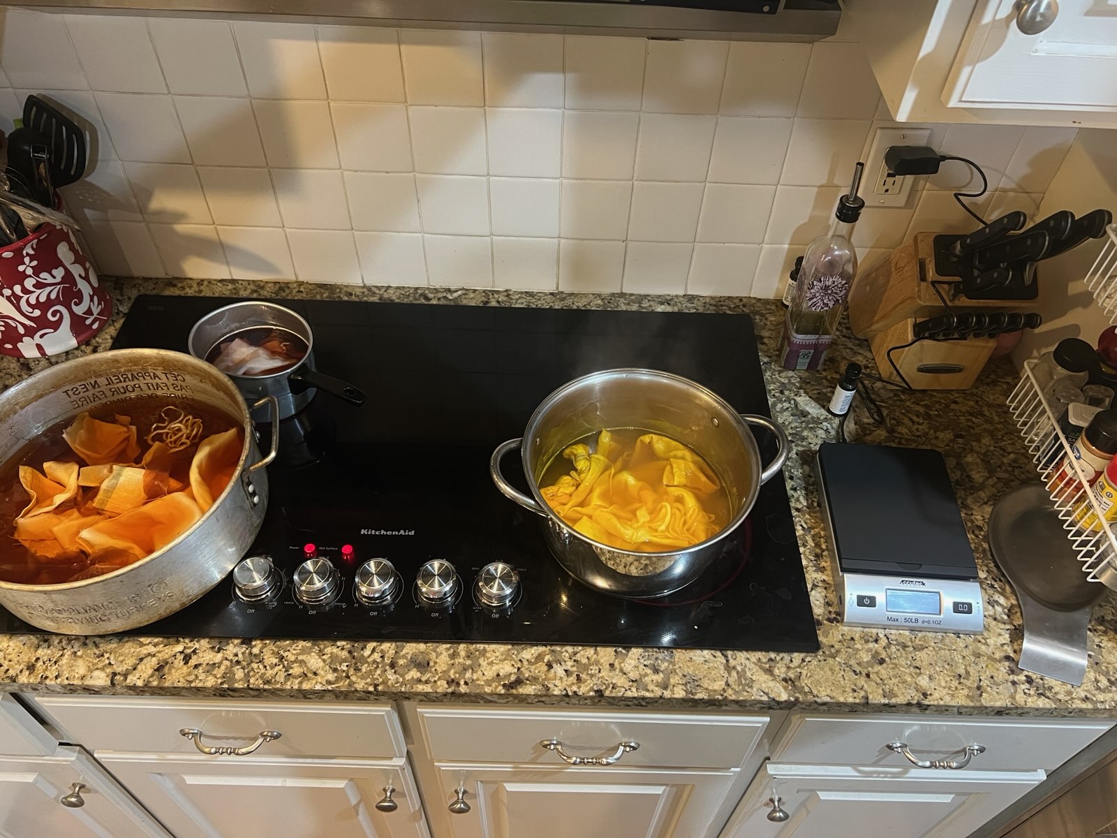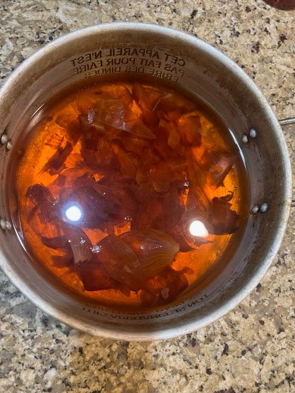 Yellow onion: put the outside layer of skin of five yellow into a pot and heated it for 90 minutes, then left the skins in there overnight