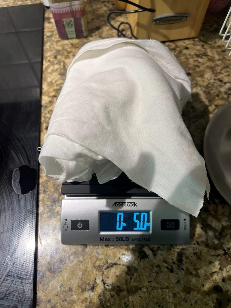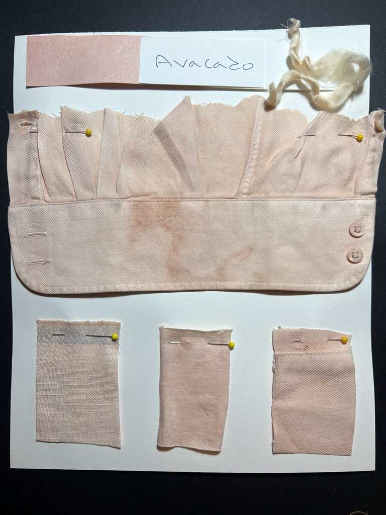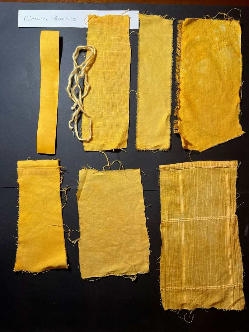 I cut a variety of cellulosic textiles into pieces, approximately 8”x10.” Weighed my 5 ounces of assorted cellulostic fiber textiles including 100% cotton knits, plain and twill weave; linen and rayon blend; and yarn. • Scoured by boiling them together in water with ½ teaspoon of soda ash • Mordanted them with alum: 15% of the weight of the fabric, 5 oz x .15= .75 oz alum, soaking at a hot but not boiling temperature for over an hour.