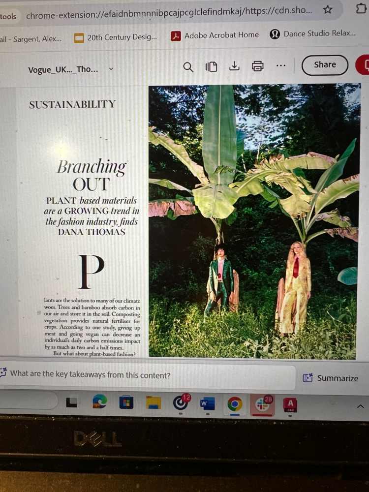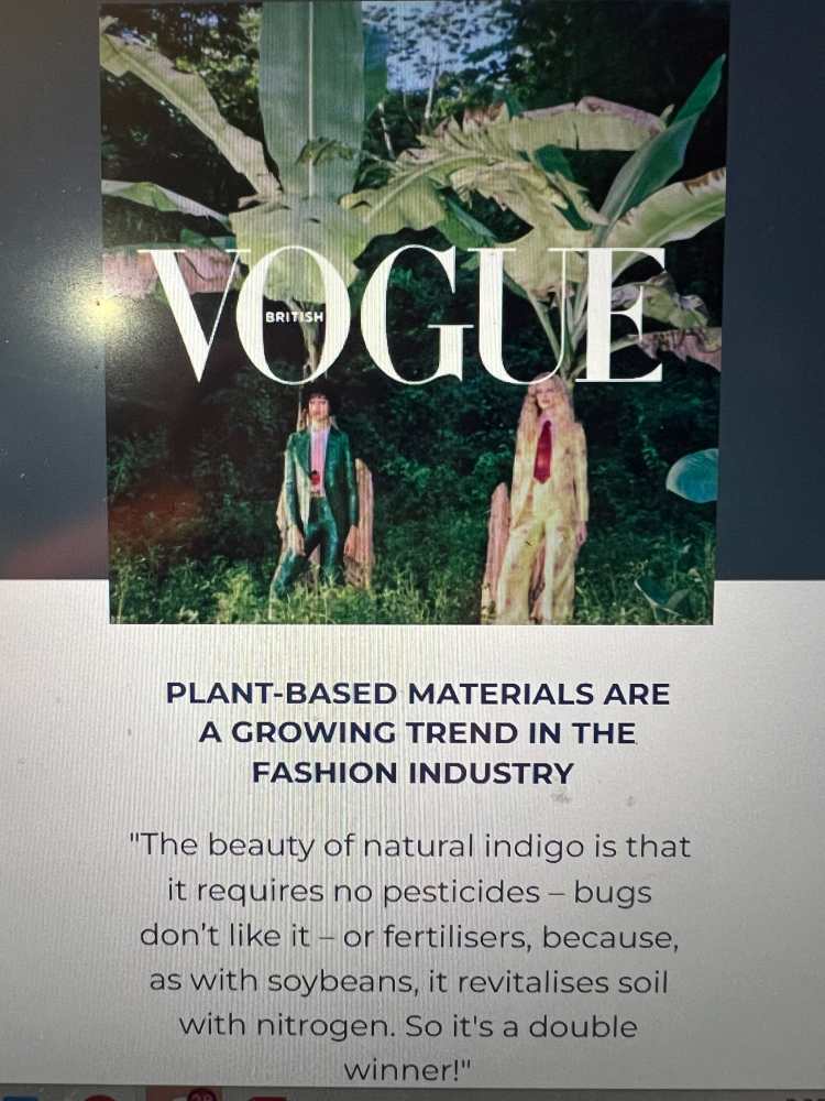 BioChromes is trending. It is inspiring to see the techniques we'll be exploring in class in magazines and advertisements that serve the sustainable fashion movement. This week's learning outcomes will help me to better understand how natural dying works so I can look for examples and applications in popular culture including magazines, sales ads, and a variety of references.