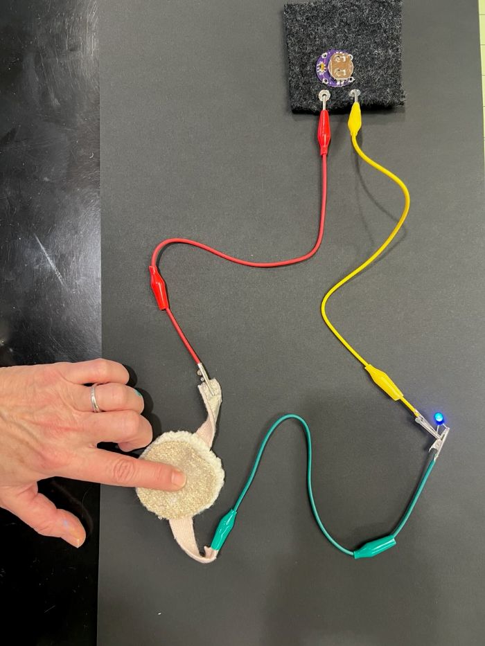 2) The same components from above, with the addition of another alligator clip and a push button switch created using felted wool and cashmere sweater pieces with conductive fabric.