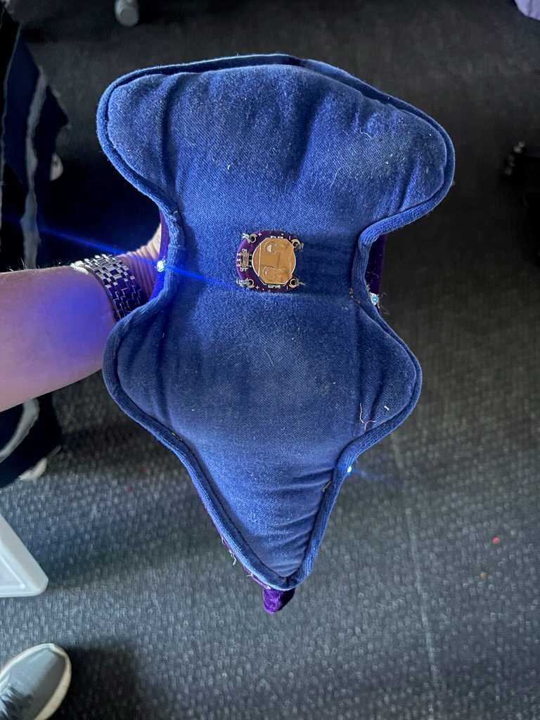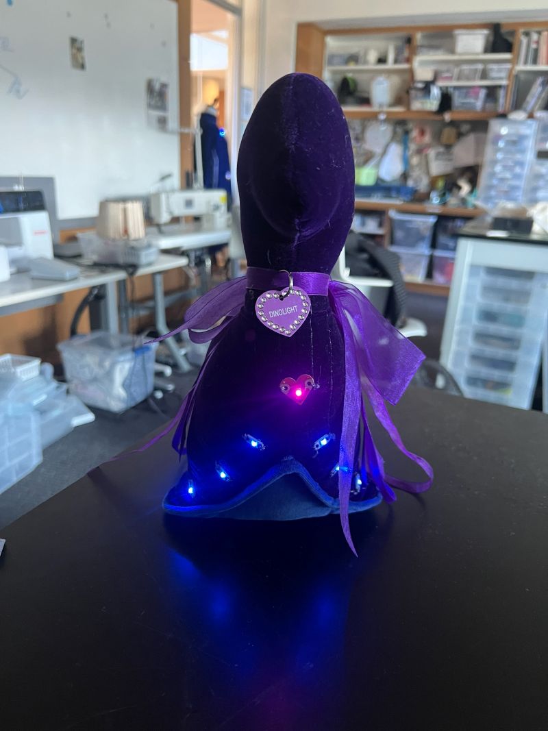 The stuffed dino, made from polyester velvet for the body and velveteen for the bottom, is stitched with two rows of conductive thread in the bobbin spaced the lenhth of an LED sequin.The rows act as channels to add LED sequins as well as the LED heart from DigiKey. Both have to be sewn with conductive thread tot channels. The interior wires run through the interior and attach to a Lilypad on/off switch at the bottom.