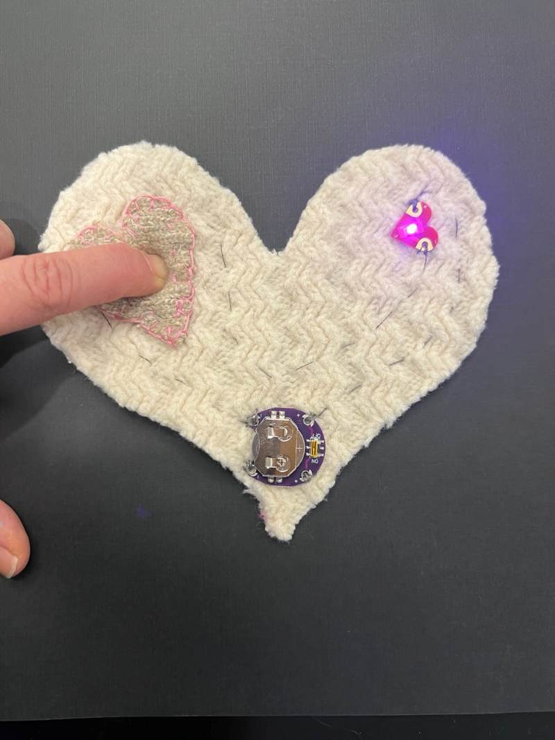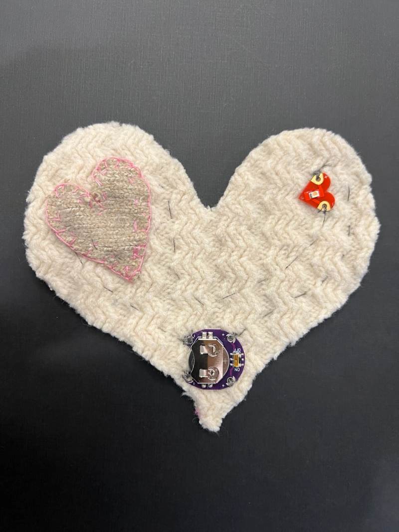 3) A felted sweater heart with a heart LED from Digikey, and a conductive push-button switch made with conductive fabric and conductive thread. I think this heart is kind of ugly and plan to redo it when I have some more time to do so. I was VERY excited to make a button on/off switch. I had been wanting to make one for a long time so was glad to have the chance to figure out how to do so.