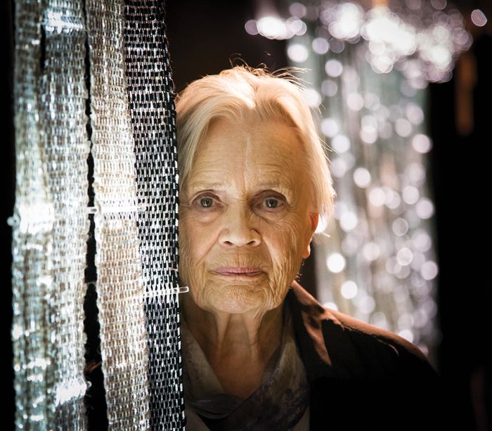 She developed a technique to combine handwoven wide ribbons into large textile artworks, often featuring light. In Corridor of Light, she wove linen yarn and acrylic rods on a fiber-optic loom and projected light onto the piece to create different shapes. She deliberately broke the fibers so that when the light projected on them, they reflected the shape she desired.