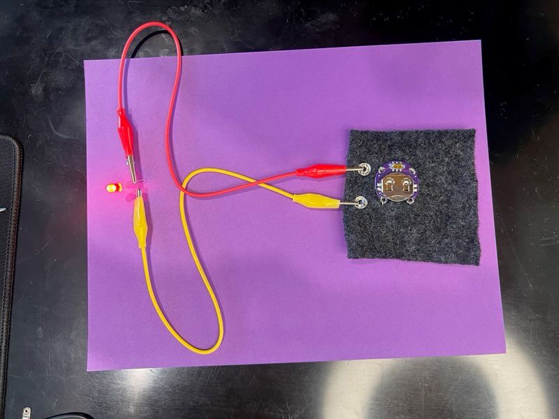 1) a square of a grey felted wool sweater; a Lily pad and 3 volt coin battery; a snap sewn on and connetce dot the Lilypad with conductive thread; alligator clips; and a blue Light Emitting Diode.