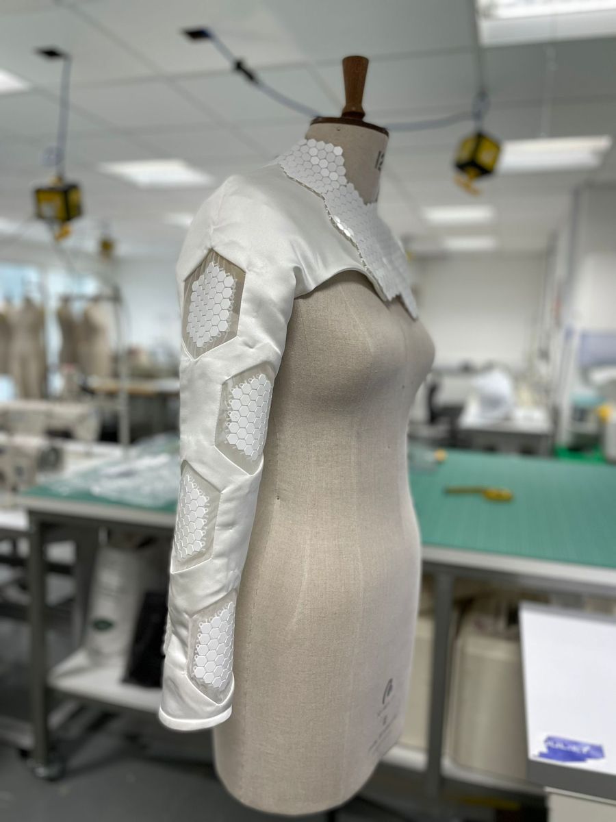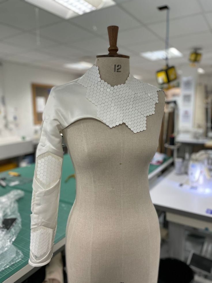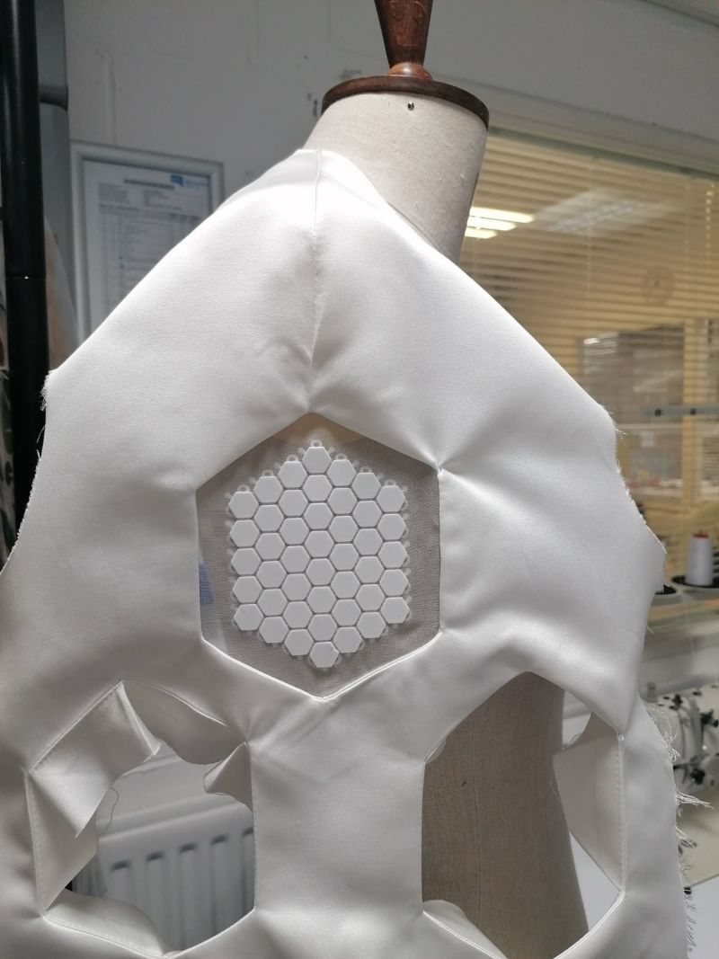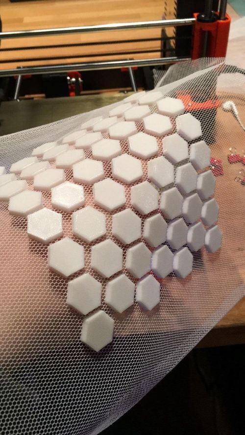 These images show an inspiring conceptual approach to 3D printing on fabric, specifically using a hexagonal shape to print onto tulle or mesh, and then building 3D printed panels into an interesting garment designed to highlight the 3D printing, either through where the panels are placed and/or by incorporating light into the garment so that the panels have a visual function.