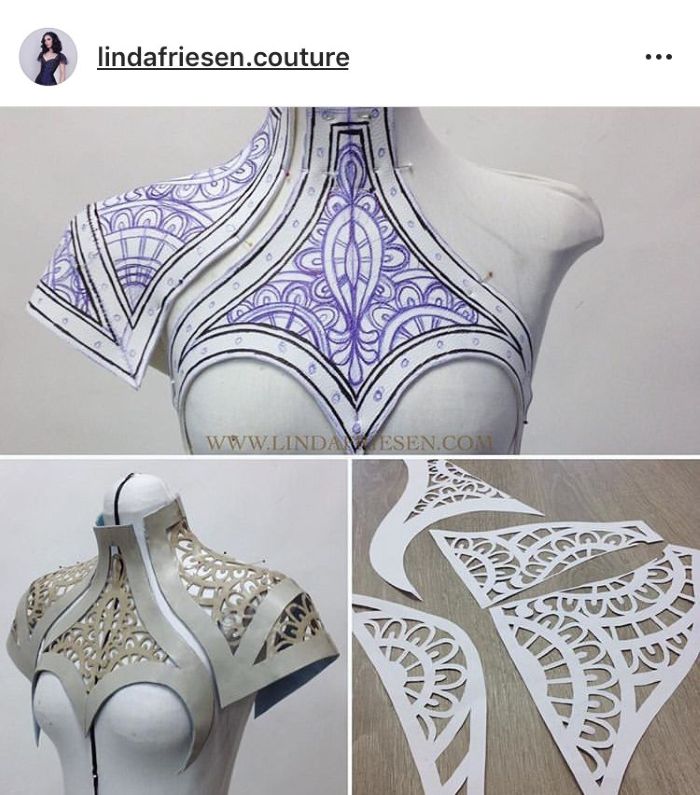 Below are more interesting 3D printed fabrics, patterns, and designs from Pinterest.The first image is an interesting approach to designing 3Dprinted panels in shapes that fit together to form aspects of the garment, here shown as shoulder and sleeve pieces and neck/front and top of bodice pieces.