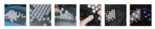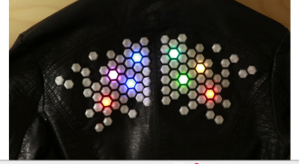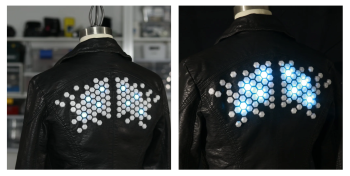 Sophy Wong writes: "This jacket has been adorned with 3D printed translucent hexagons and individually addressable LEDs. I printed the hexagons in PLA directly onto black nylon mesh fabric to create a flexible appliqué that could be sewn to the back of the jacket. The LEDs can be programmed with visual animations and patterns in any color, or made to respond to ambient sound, temperature, or the wearer’s movement. Full tutorial and downloadable files for this project were published in issue 18 of HackSpace Magazine and in my book, Wearable Tech Projects."