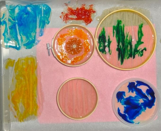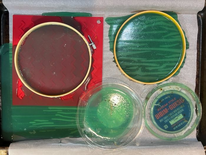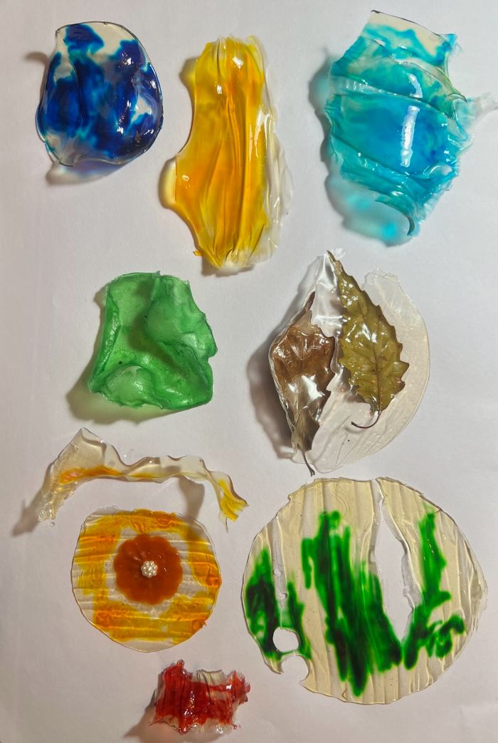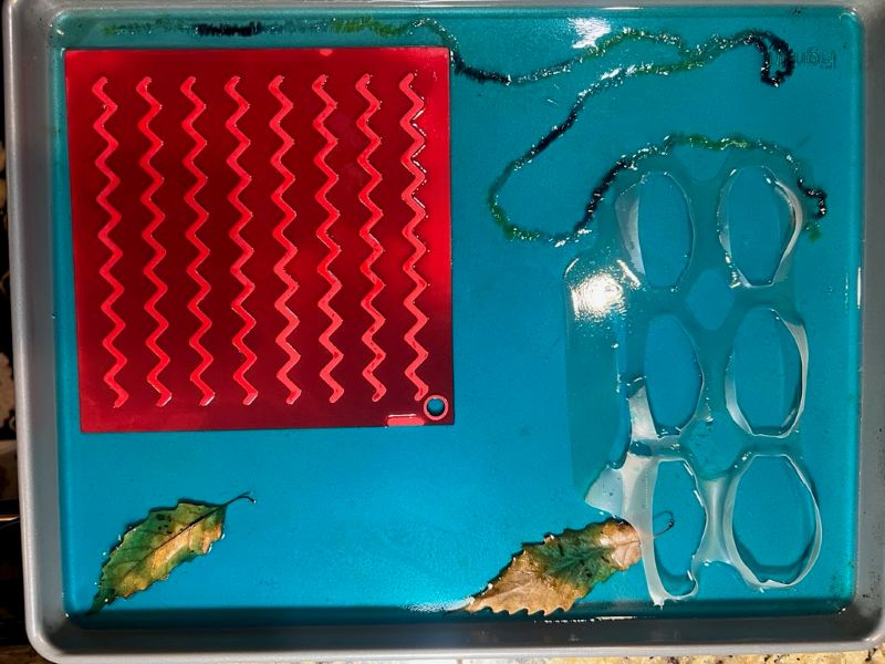I poured it all into a baking tray, with a textured silicone oven pad, a few leaves, and a plastic soda bottle holder, just to see what the bioplastic sticks to and if any of these items will create any interesting texture. I am interested in making some leaf earrings, so will use this piece to test some various approaches.