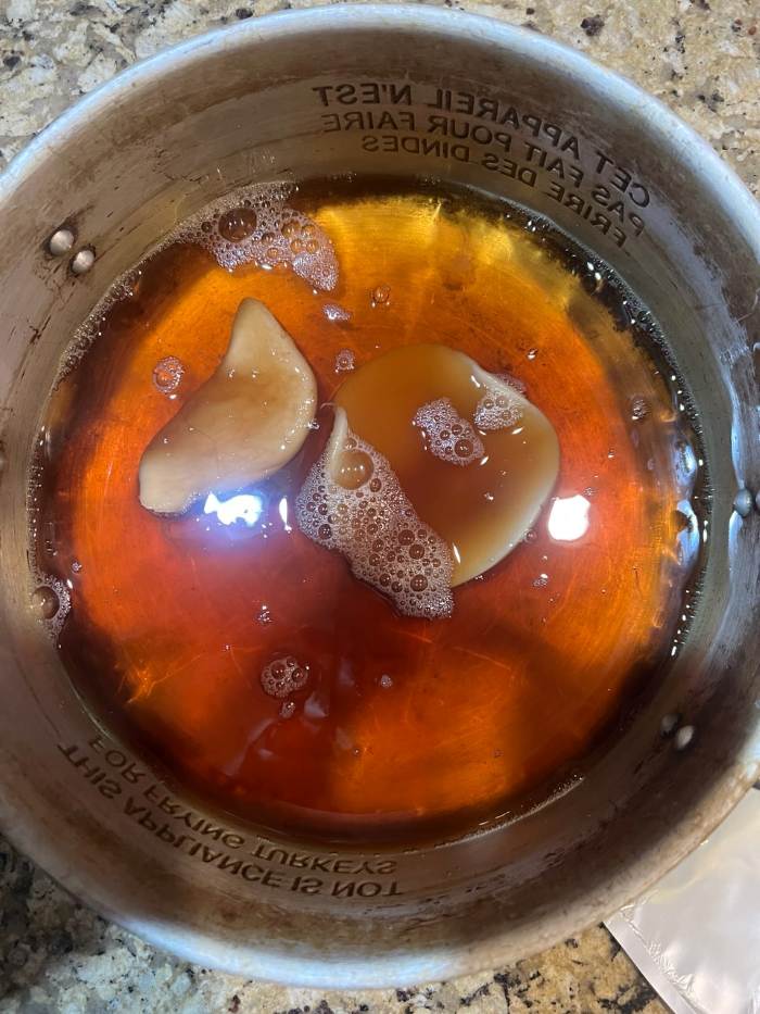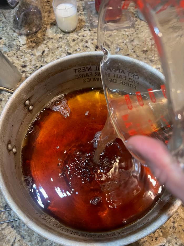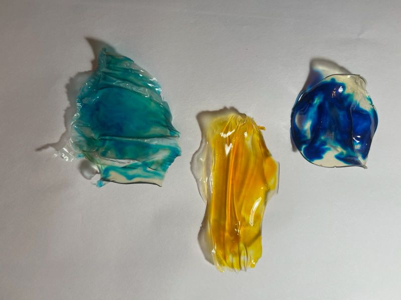 1) Heatwater in a pan until it’s warm but not boiling. 2) Gradually dissolve the gelatin into the water, stirring to avoid clumps. 3) Add glycerin and continue stirring until the mixture is fully combined and smooth. 4) I added a drop of blue food coloring.