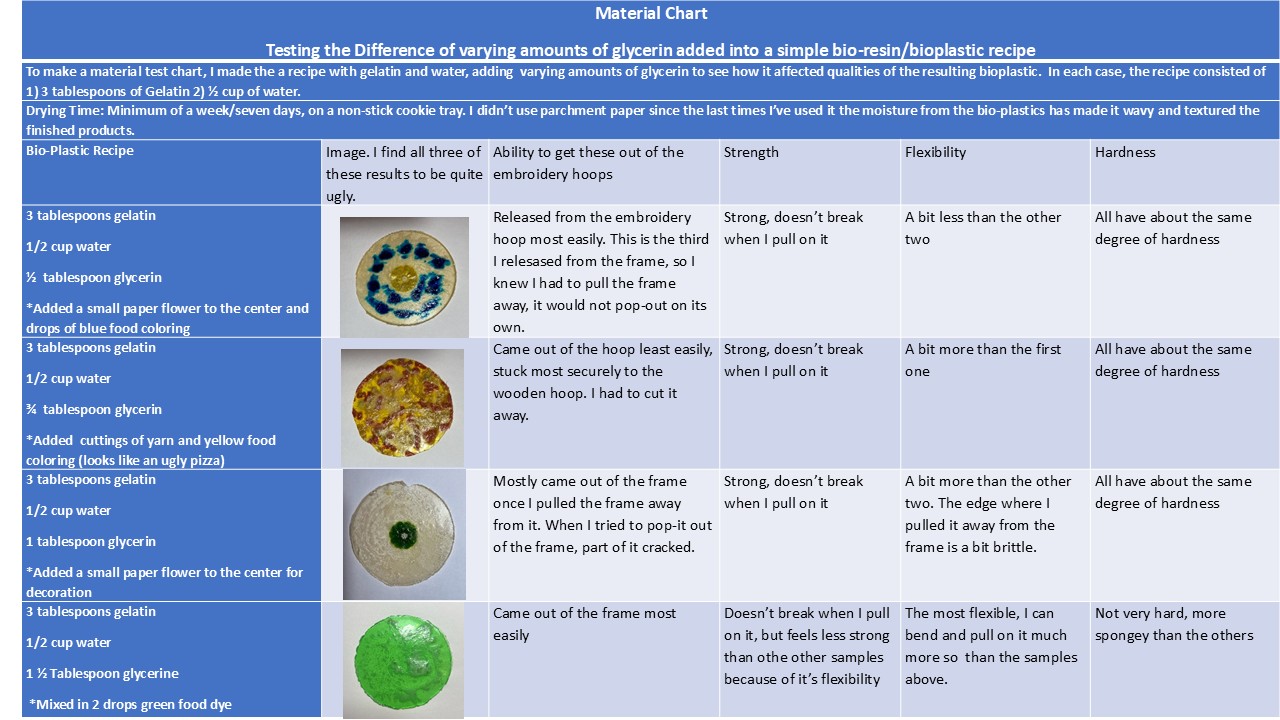Here is materials chart to compare the effect of varying amount of glycerine on bioplastic
