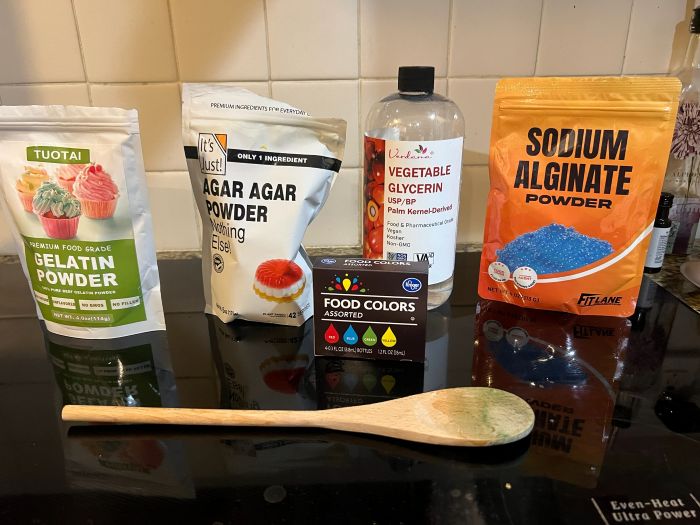 Ingredients: 1) 1 teaspoon agar powder 2) 3 tablespoons water 3) 1 tablespoon glycerin 4) 1 drop food coloring