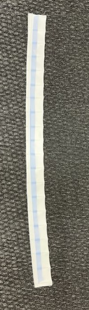 Steps: 1) Cut a strip of the Heat Sealable Coated Nylon Taffeta measuring 5" x 36" 2) Place a 1/2" wide piece of painters tape 3/4" from one long edge of the fabric 3) Fold the fabric, plastic sides together, and mark every 2" 4) Heat seal: the long end; one short end; and every two inches. The painter's tape will leave a channel open for the air to flow through. 5) Sew a strip from two pieces of black grosgrain ribbon to hold the channel together at intervals. I choose both 2" and 3" intervals to see which one worked best. I started by cutting and prepping a waistband from a discarded pair of jeans by backing it with a 3" wide strip of grosgrain ribbon, but felt tat might be a bit too thick and heavy and lacking in ease of movement. 5) Insert hard plastic pieces into the strip, each one 2-3 " long, so that when the heat-sealed strip fills with air, it will expand and cause the strip to curl-up.