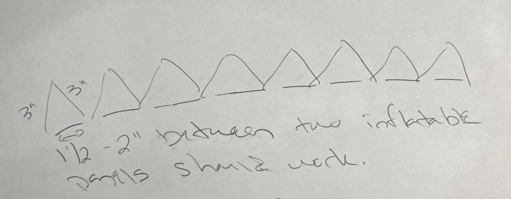 I re-made this project to try to get it to successfully curl in. I am very excited with the result, it works! Steps: 1) Cut a strip of the Heat Sealable Coated Nylon Taffeta measuring 7" x 60" 2) Place a 5/8" wide piece of painters tape over a 1/2" strip of muslin, 3/4" from one long edge of the fabric 3) Fold the fabric, plastic sides together, and mark every 3" 4) Heat seal: the long end; one short end; and every three inches. The painter's tape leaves a channel open for the air to flow through, and the muslin helps the tape not stick too much so the air can get through easily. 5) Sew two pieces of black grosgrain ribbon on both ends to hold the channel together at 2" intervals. 5) I inserted a soft pliabe plastic strip into 2" long "pockets" I made in the grosgrain, so that when the heat-sealed strip fills with air, it will expand and cause the strip to curl-up. I calculated how long the intervals on the grosgrain should be on based on the triangle the height of inflated fabric pockets.