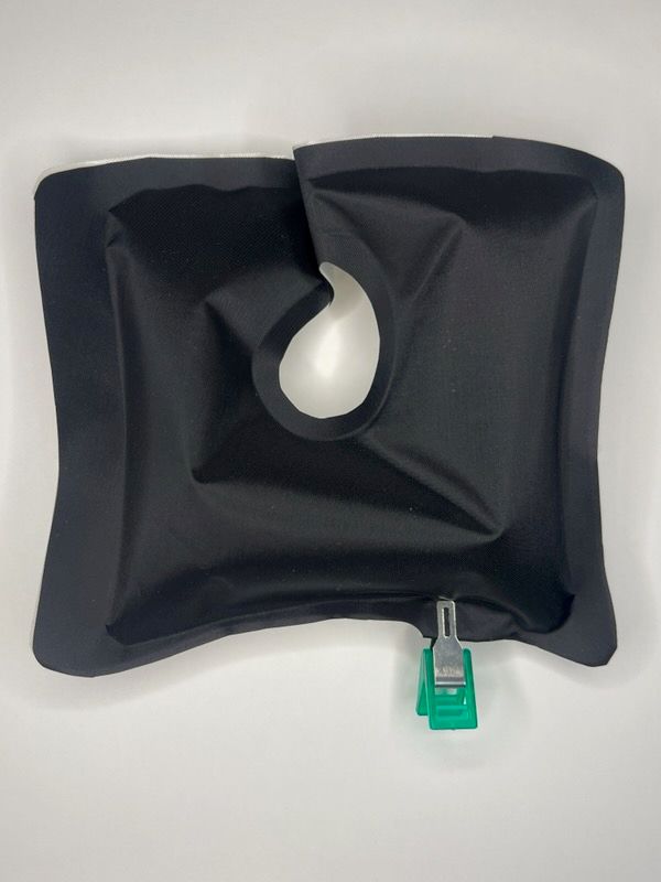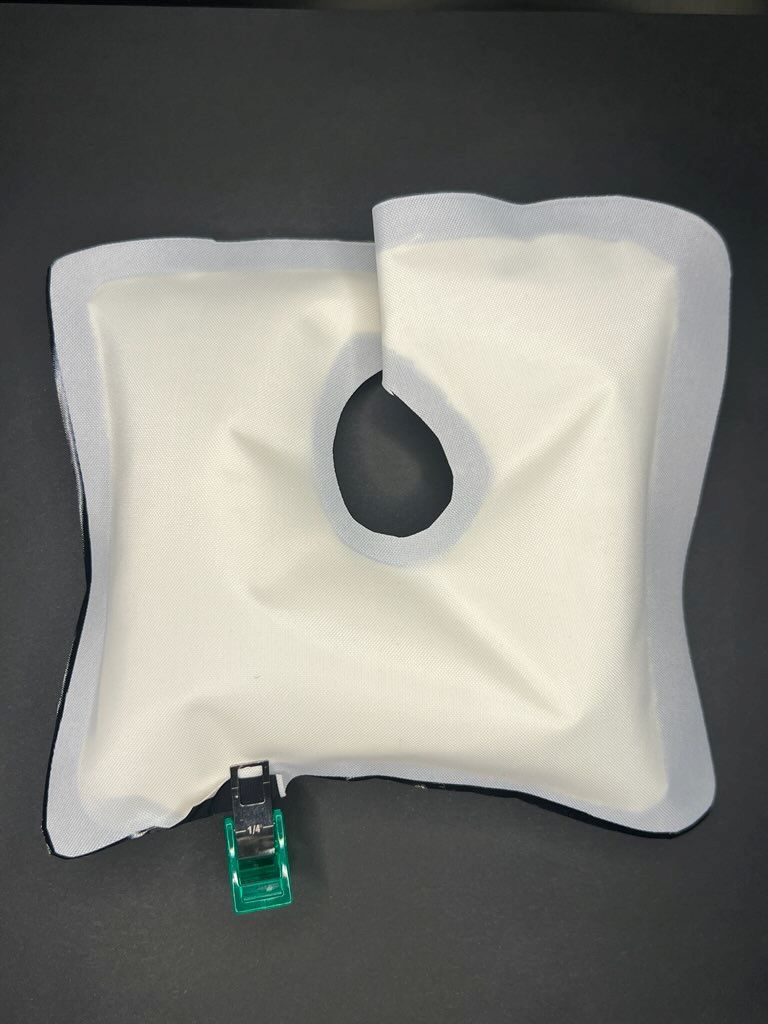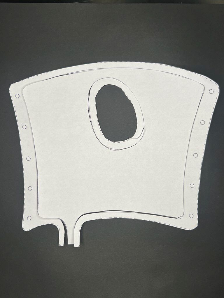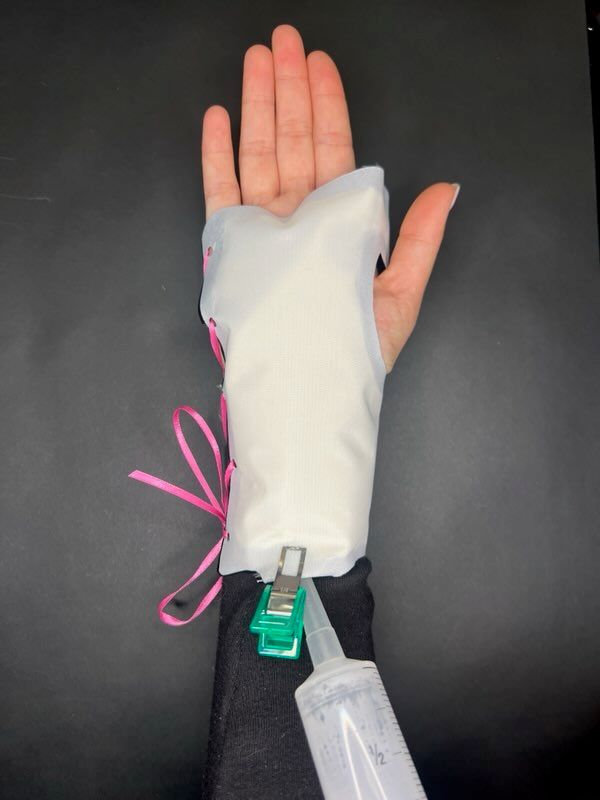 Steps: 1. Download image 2. Cut front and back from Heat Sealable Coated Nylon Taffeta 3. Cut out thumb piece 4. Cut smaller piece, as indictaed on the pattern, from musilin to sit between the layers when melting them together 5. Used the heat vinyl heat press to melt the front and back together 6. Punched five holes in each side 7. Added lacing 8. Blew it up and tried it on 9. It fits and it works!