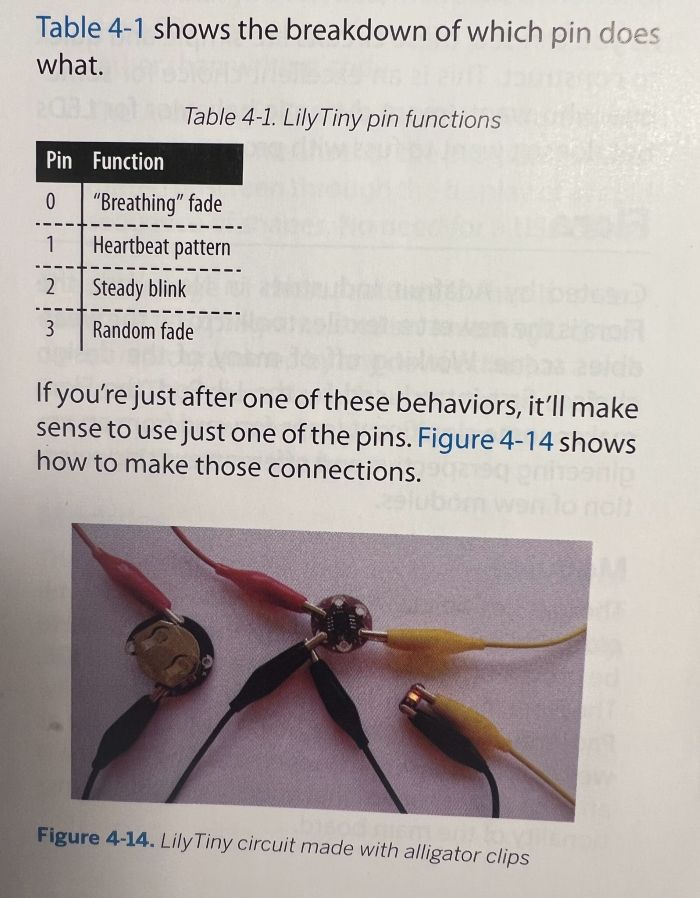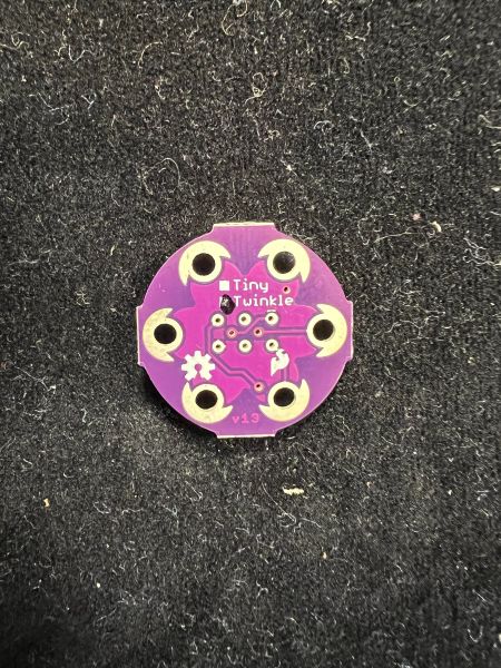 From the SparkFun Electronics website linked here that sells LilyPad's Tiny Twinkle microcontroller: "Product Overview The LilyTwinkle is a tiny little LilyPad board designed to add some twinkle to your project. Even though it's as small as some of the LilyPad sensors, this board actually has an ATtiny microcontroller on it so it's actually pretty smart! Simply sew on 4 LEDs and connect a battery and the LEDs will twinkle-fade (a lot like fireflies... or lightning bugs, if that's what you call them). LilyTwinkle is a quick and easy way to add twinkling lights to a project without any programming or a bulky Main Board."