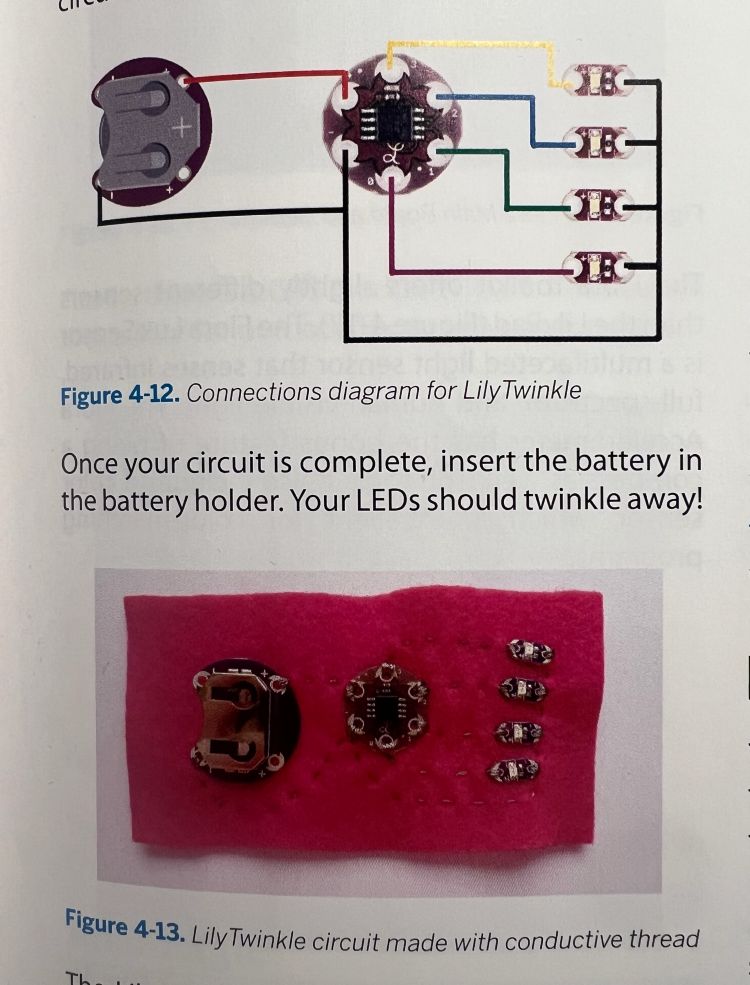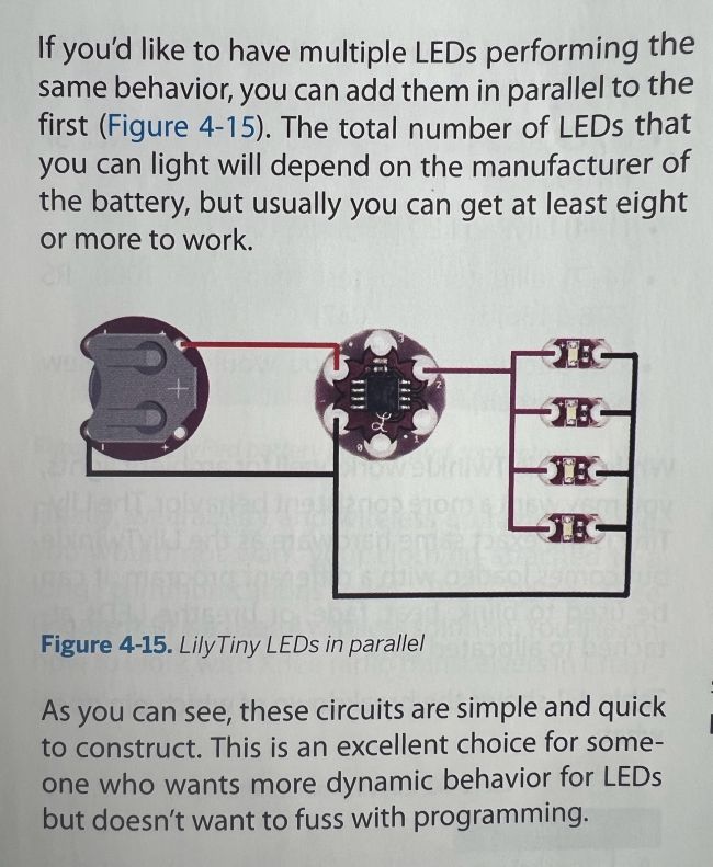 1) I plan to make the parallel circuit below using Lily's Tiny Twinkle from an example in my Wearable Electronics book.