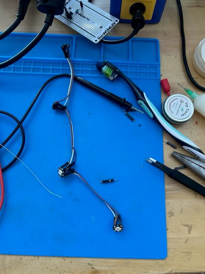 I soldered four wires to each of my four neopixels to make them into a chain. The wires allow the chain to be flexible so I'll be able to have them show through holes I'll cut in a piece of leather, to replicate applying this project to a leather jacket, through which the light of the neopixels will show.