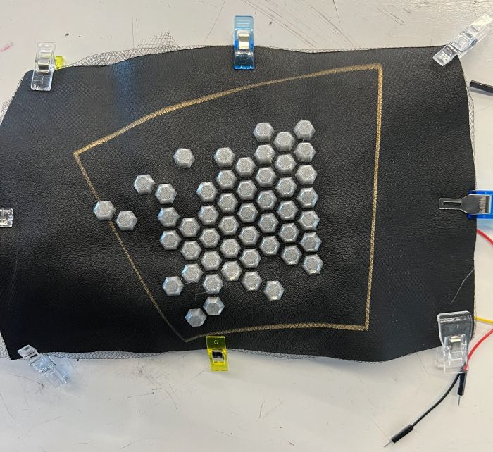 2) I have outlined the jacket back panel as if this project was being applied to a jacket. I've clipped the 3D printed fabric to the leather, and taped the neopixels to the back with the lights lined-up with the holes I punched. The video shows the effect working.