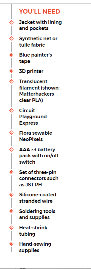 I plan to create the lighting effect for Sophy Wong's 3D-printed jacket mod with LEDs. I made the tulle with 3D printed mesh for my Week 6 Comptational Couture assignment. The list of supplies for the whole project, which can be found through this link, is below: