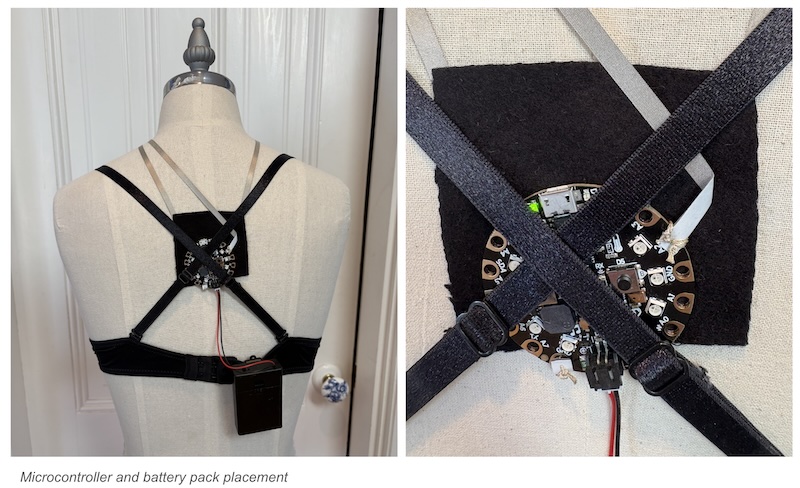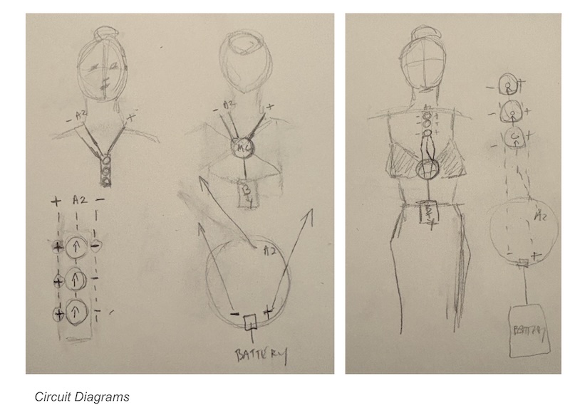 I then pivoted to mapping out connections in 3D on a dress with assistant Genevieve Hildebrand-Chupp, which proved more effective. I also reviewed the previous project recommendations and noticed that most people were using the adhesive tape connecting the microcontroller to the programmed elements. I used a bra to secure the microcontroller and battery pack and then draped adhesive conductive tape to form the "chain" of my necklace. I then used alligator clips to text the effectiveness of the tape. Below is the test video for the 3D sketch.