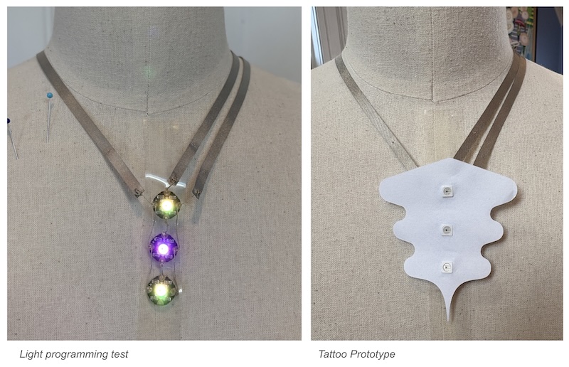 We then developed a paper sample of the tattoo shape which would mask the connection points. Once we had the shape and openings fit over the NeoPixels: