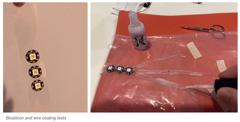 After successfully programming the microcontroller, my focus turned to figuring out how to attach them on to the body in the most invisible way possible. I used a thin layer of biosilicon that I created in Week 7 as a substrate and attached the NeoPixels and used double sided tape to determine their position on the body.