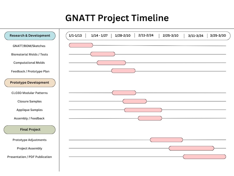 Building off feedback I receive at the midterm presentation, I will develop a full scale prototype of the modular garment and the interchangeable elements. I start will start by refining patterns for the modular garment elements in CLO3D and testing closure systems created using biomaterials. I will expand on the parametric pattern sampling from the first phase to create more refined decorative panels that can be applied to the garment.
