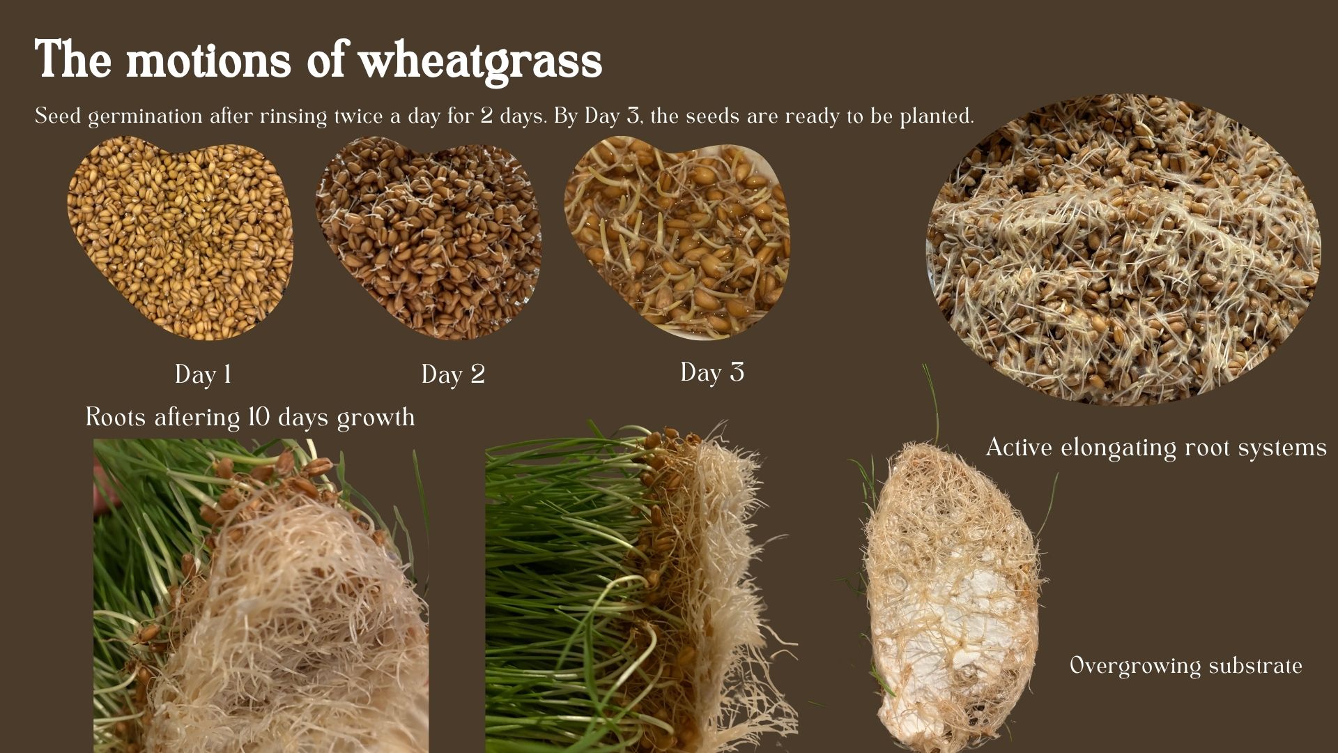 In addition to wheatgrass root systems, I experimented with chia and flax seeds to investigate their behaviour as surface-growing materials.