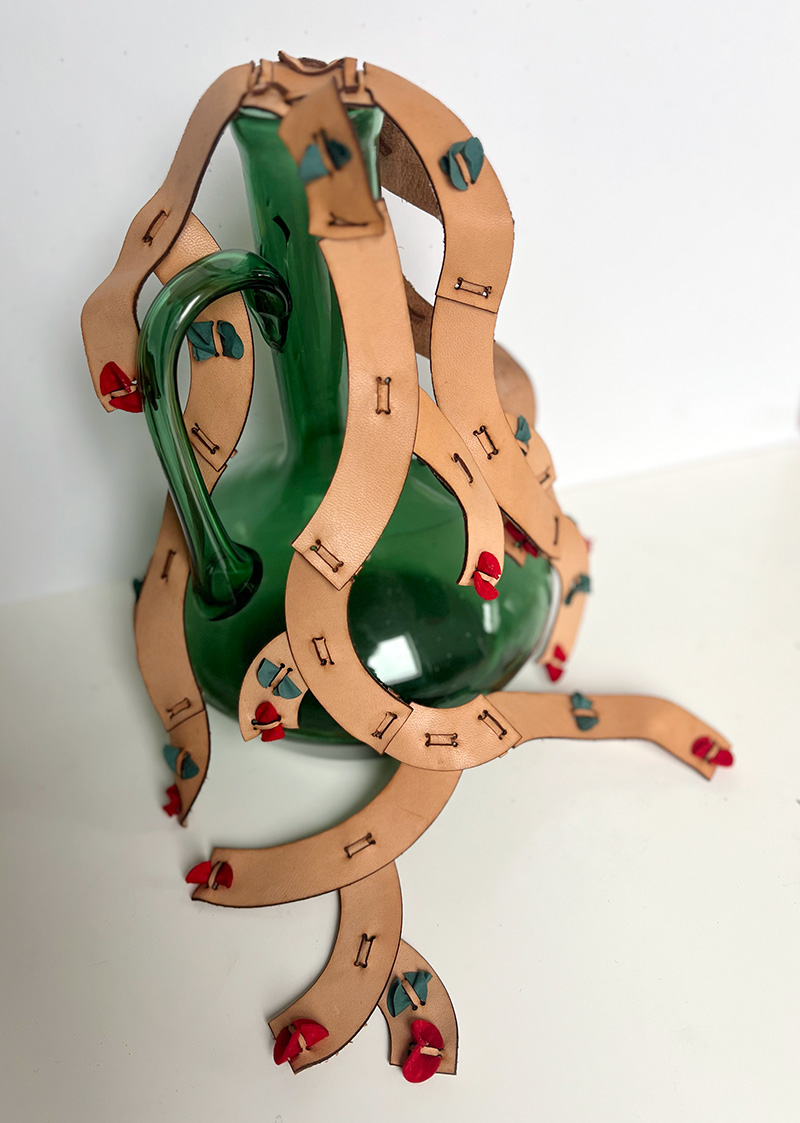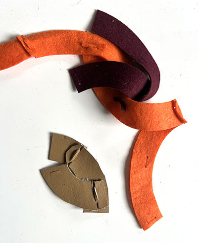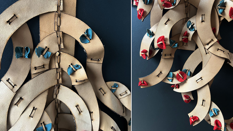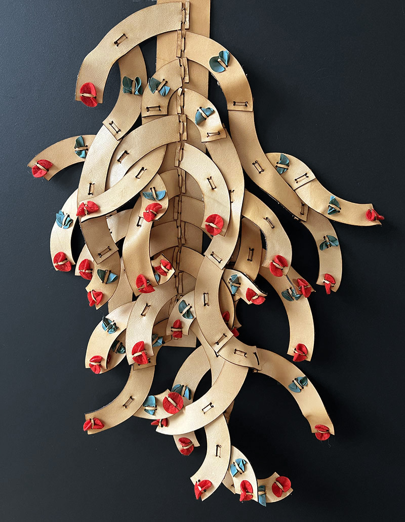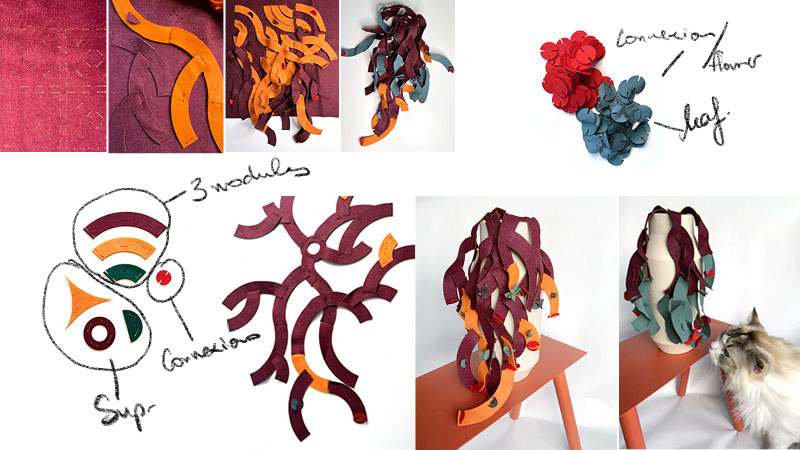 With the help of my clamp, I was able to create a wall assembly and a round assembly. The petals are made of red felt, and the leaves are made of light green fabric. These two elements can be placed in single, double, or even triple to create volume.