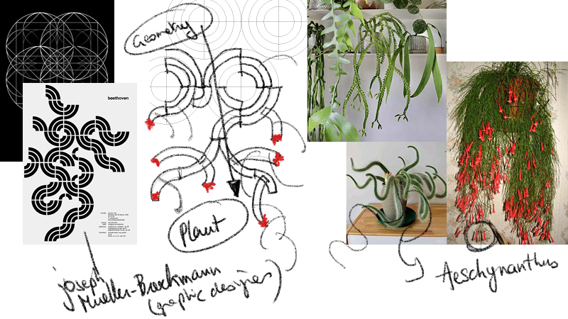 My challenge is to combine geometric design with a plant system by analyzing the structural elements of both and identifying ways to integrate geometric shapes from the Swiss International Style into organic plant forms. I will explore this by mapping plant growth patterns and overlaying geometric frameworks to create new visual languages: Geometry to organic plants.