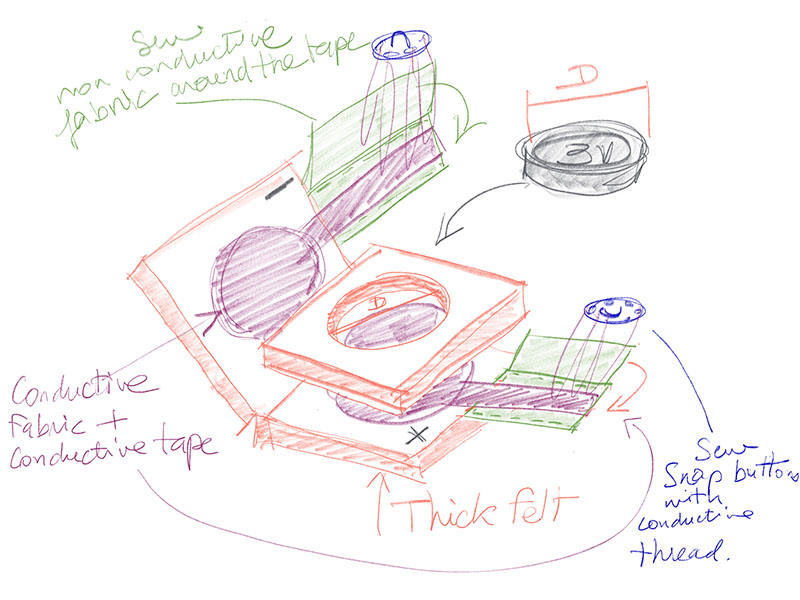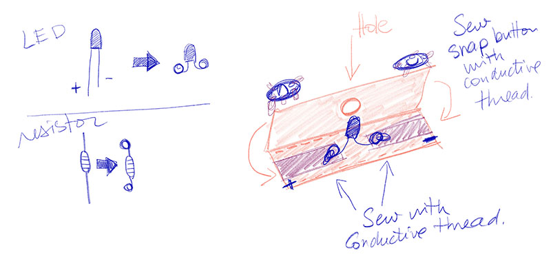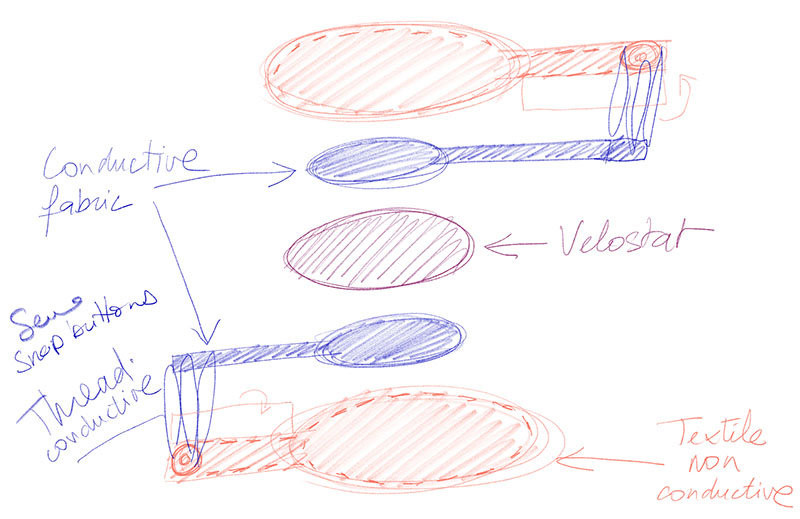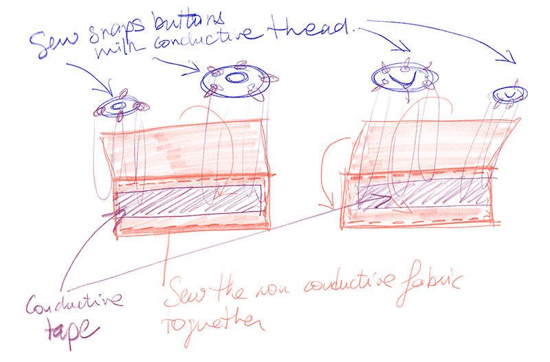 I show below diagrams with hand snaps to sew with conductive thread. To be faster, you can use the metal snap buttons to place with a clamp or a lever machine.
