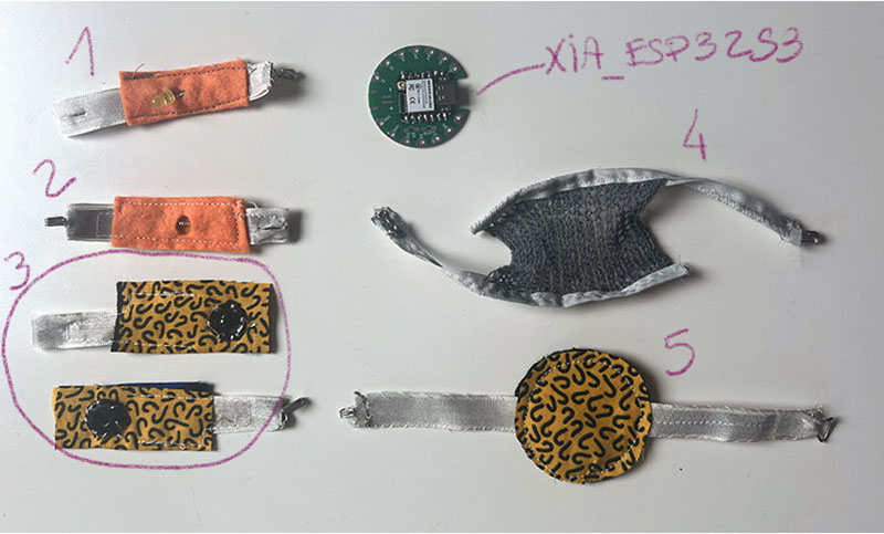 - Cut: 2 pieces of conductive fabric (diametre: 5cm), 1 larger piece of VELOSTA (Dia.: 6cm), 2 larger non conductive fabric (Dia.: 8cm)