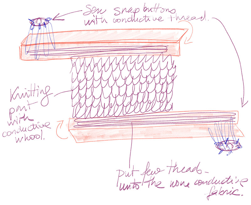 - Knit a small piece with conductive wool (not very conductive…). Use a soft setting to achieve loose knitting (or use larger needles).