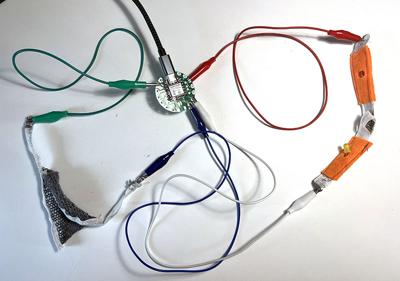 This type of sensor button will allow you to vary the output by pressing the knit to decrease the resistance of the material.