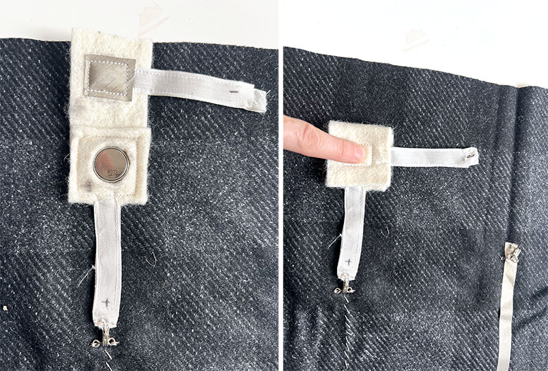 For all these elements, I took hook-and-bar loop fasteners. The hook is the positive of the LED, and the bar loop is the negative. The connection is not perfect, and it’s pretty tedious to sew.