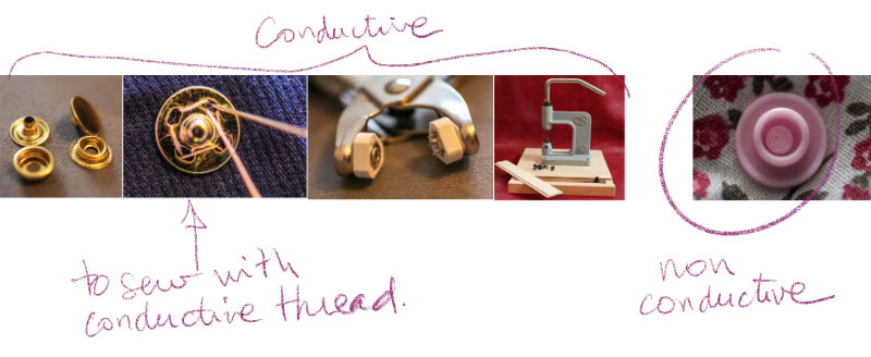 - Sew snap buttons with conductive thread, or clamp a metal snap button.