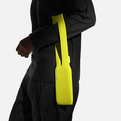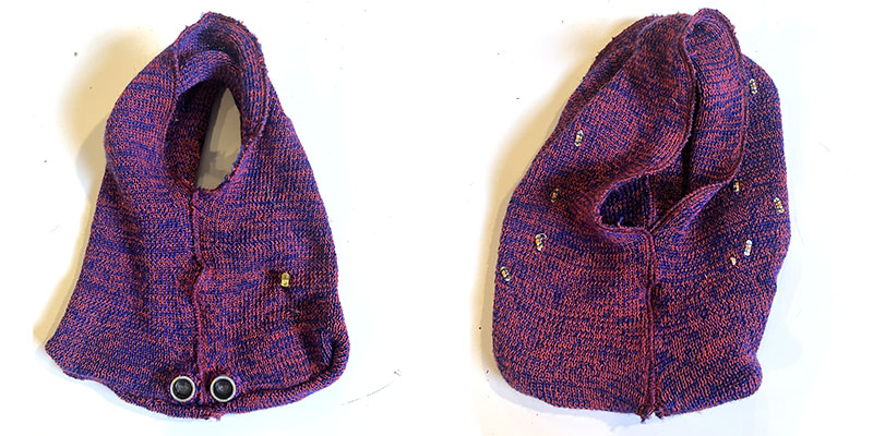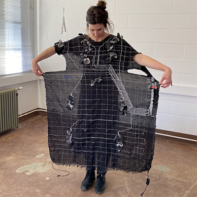 (Right) Wear, designed and made by Laura Devendorf, is a project that explores how we might use technology on the body to reflect upon embodied experiences. Created during the 2020 COVID Lockdown, it is a handwoven garment with 21 force sensors that capture where her body encountered pressures (from children, objects, etc) for 24 hours. These experiences of pressure and touch can be replayed via heating circuitry in the cloth, allowing the recorded experiences to become visible as heat across the garment and body.