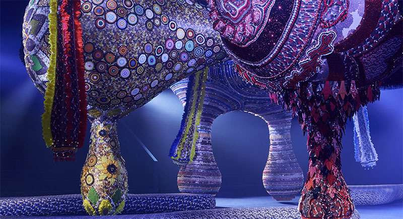 Artist Joana Vasconcelos sets the backdrop of Dior’s AW23 show in Paris with her kaleidoscopic fabric-filled installation ‘Valkyrie Miss Dior’. The epic, site-specific textile installation Vasconcelos infuses floral textiles inspired by the House’s archives.