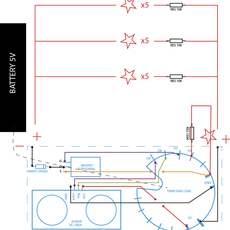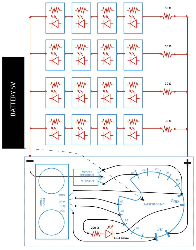 I reused the embroidery machine to make my circuit on poppeline in a rectangle that allows for the best housing of the Fabrixia, the sonar, the Mosfet and the diode. Are the LEDs and their resistances externalized and placed in parallel on the knit?