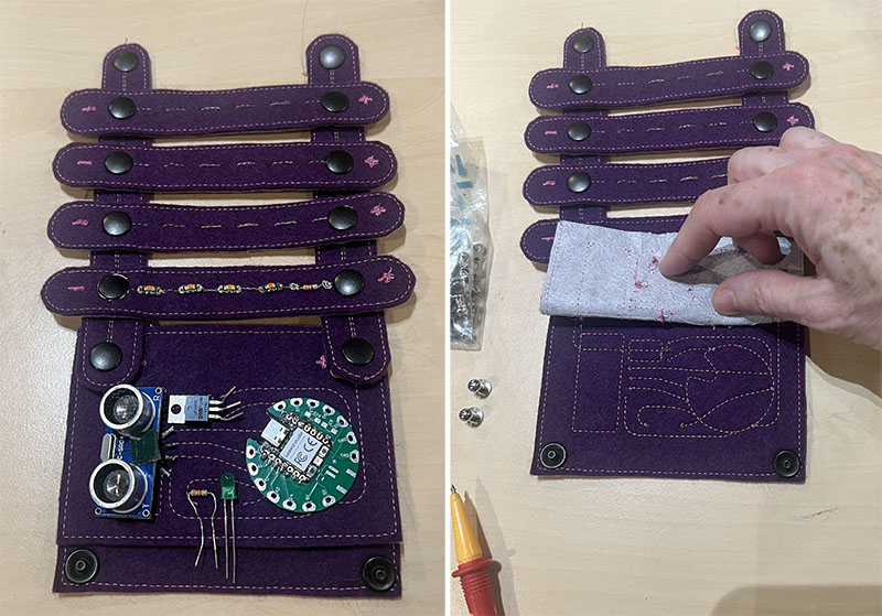 The result is quite successful, the felt and the hook systems are very interesting to be able to present the circuit in a fun and portable way. The chosen snap buttons are not conductive, I will have to redo this prototype with unfinished, silver-plated buttons. The electronic test is not yet feasible.