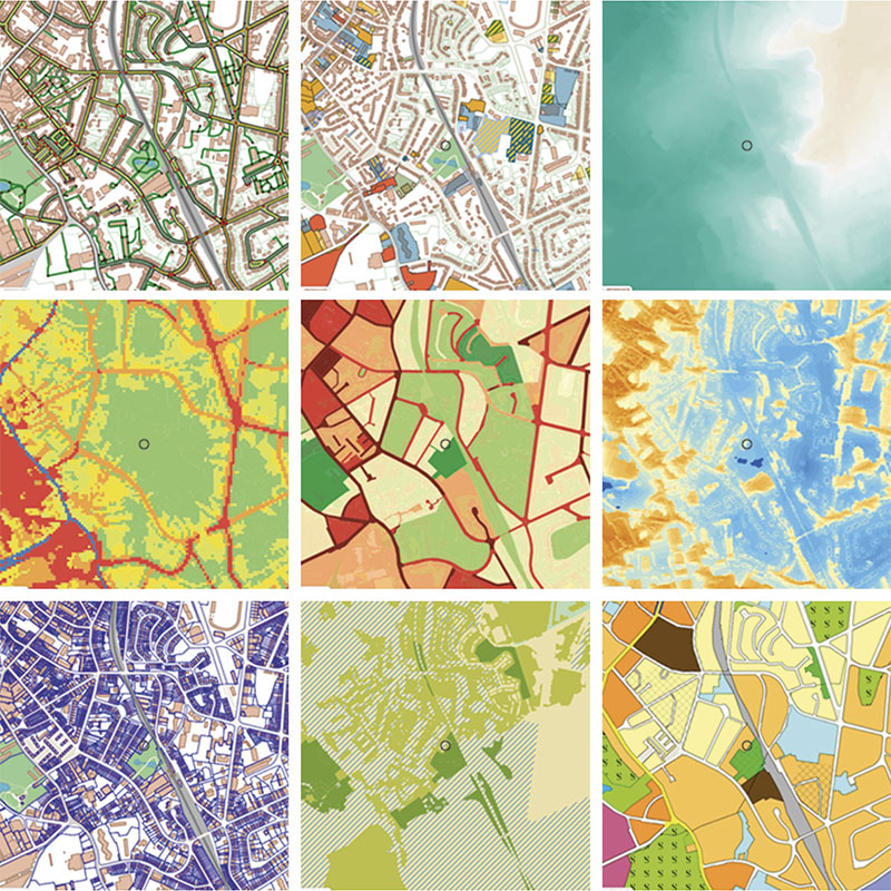 Soil polution / Land use / Ecologycal network / land registry / urban heat island / vegetation cover / road noise / altitude / transportation system / Rail noise / Level lines / Flooding 2019 and Lack of public green spaces