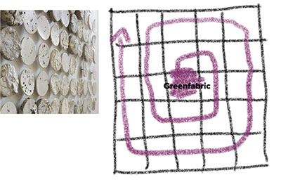 2- Sourcing materials to be recycled in each zone by walking and meeting people, merchants, and professionals. Creating a biomaterial per area. To facilitate the task and link the territories around us, the square in the center representing the Greenfabric will be 100% textile, then, concentrically, textile + recovery, with decreasing textile concentration.