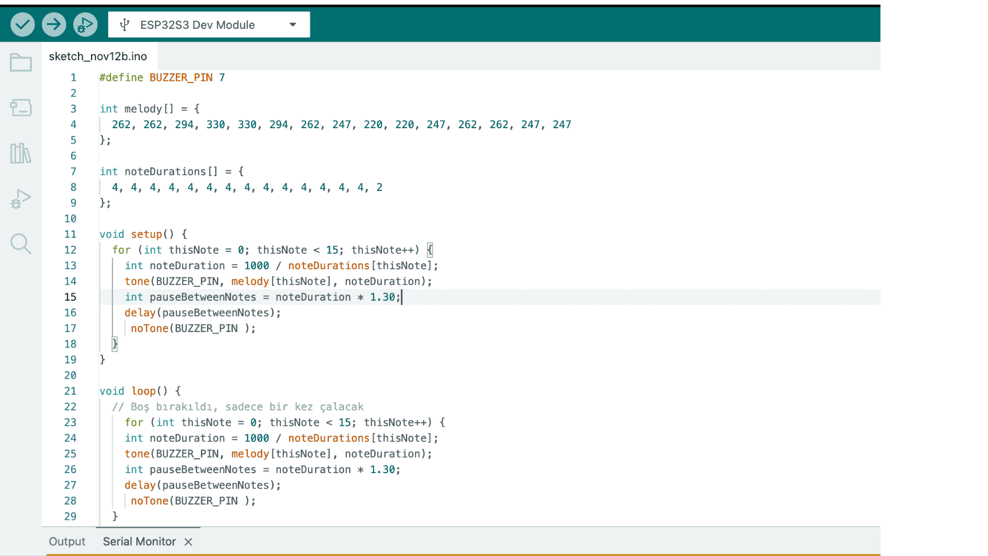 void loop() { // Boş bırakıldı, sadece bir kez çalacak for (int thisNote = 0; thisNote < 15; thisNote++) { int noteDuration = 1000 / noteDurations[thisNote]; tone(BUZZER_PIN, melody[thisNote], noteDuration); int pauseBetweenNotes = noteDuration * 1.30; delay(pauseBetweenNotes); noTone(BUZZER_PIN ); } delay(2000); }