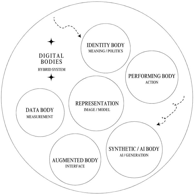 | Synthetic / AI Body | Generation and simulation | AI models, algorithms, datasets | Representation, Identity Body |